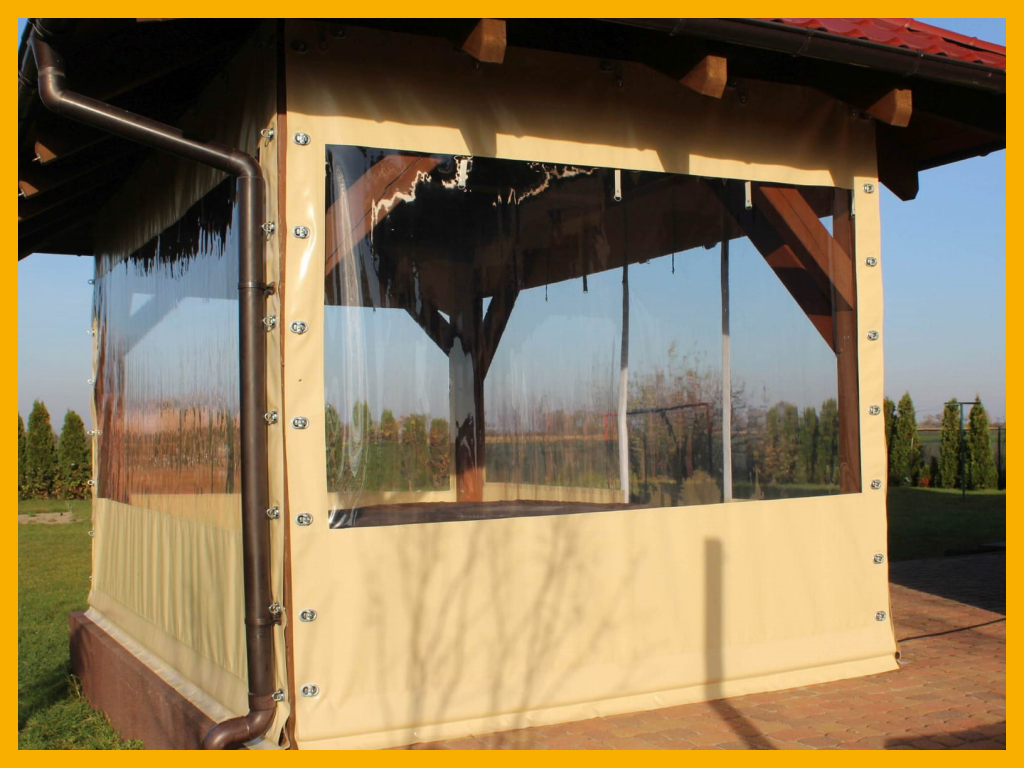 We make transparent terrace shades for complete protection against rain and wind. This solution allows you to enjoy the delights of relaxing outdoors for longer, even after the summer season is over. The product is ideal for both private properties and commercial use: such as bars or restaurants. The shades are made of very strong 680 g/m² tarpaulin fabric with 0.7mm transparent windows. The standard finish is eyeleting on the top and sides; and at the bottom we make a 10cm flat tunnel. We always fit the product individually to the structure. The whole is very easy to maintain on an everyday basis.