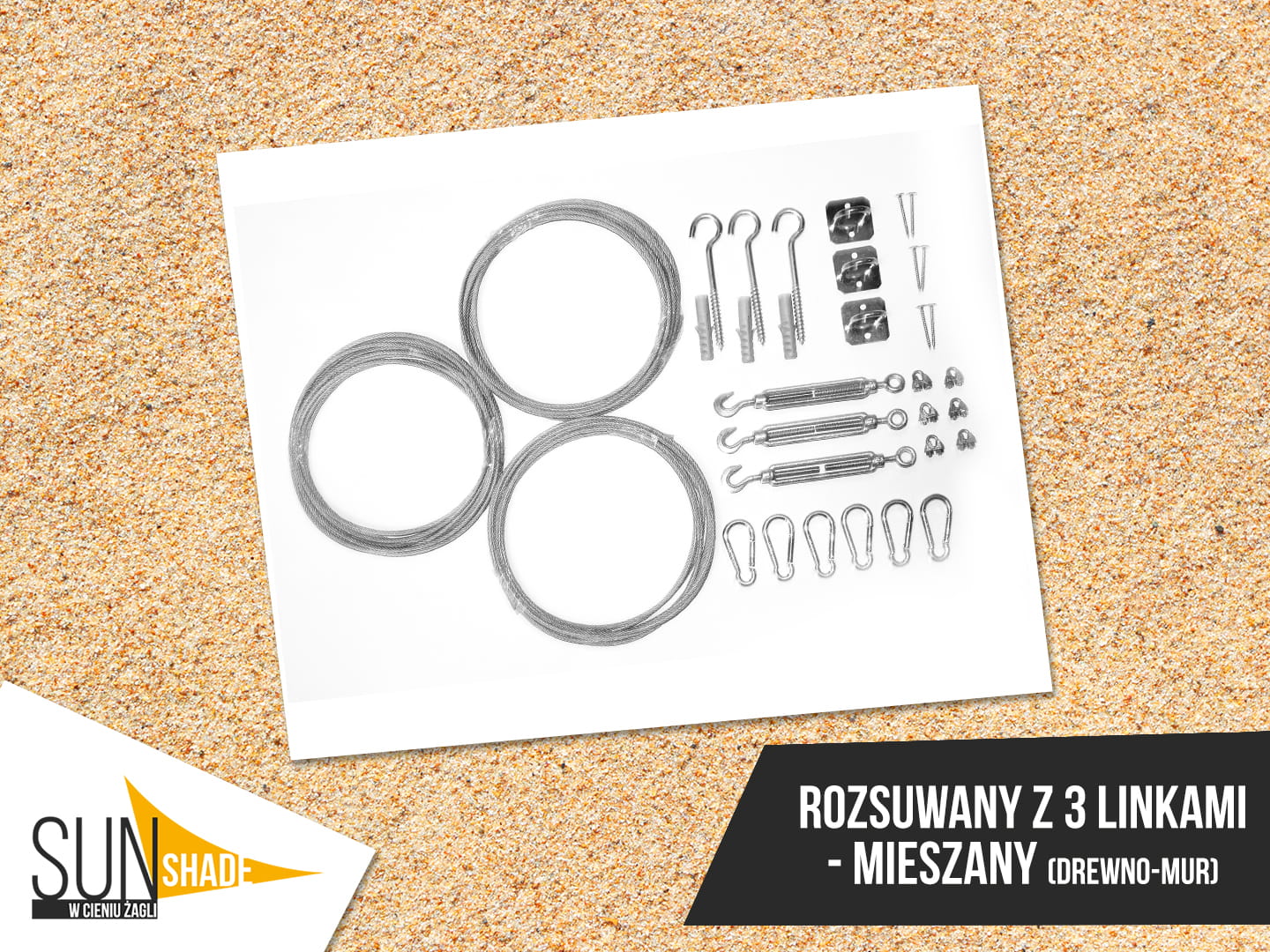 There is a steel cord interlaced through the mounting holes installed on the edges of the sun sail - which is used to spread and retract the sun sails depending on the current need. All the mounting hardware can be found on our other auctions.