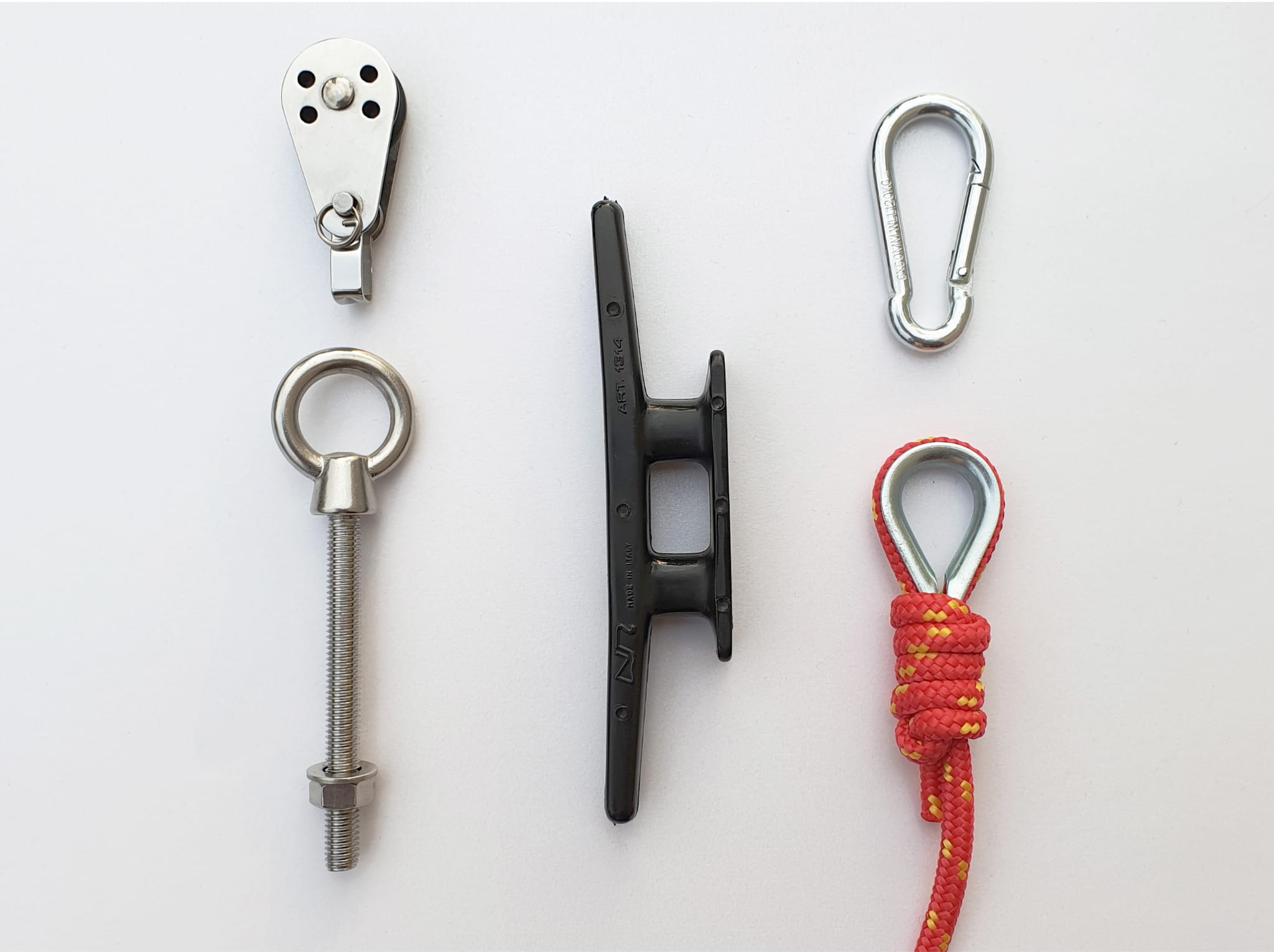 Sarja sisältää kaikki tarvittavat osat aurinkopurjeiden helppoon ja turvalliseen kiinnitykseen.