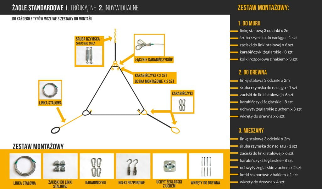 Suosittelemme, että purjeissa, joiden sivut ovat yli 3 m pitkiä, käytetään ylimääräistä kiinnityspistettä puolessa välissä sivua. Rakenteen kiinnitysmahdollisuuksien mukaan on lisättävä sopiva määrä ylimääräisiä kiinnityspisteitä. Lisäpisteen hintaan sisältyy koukku ja kiinnityskannatin rakennetta varten.