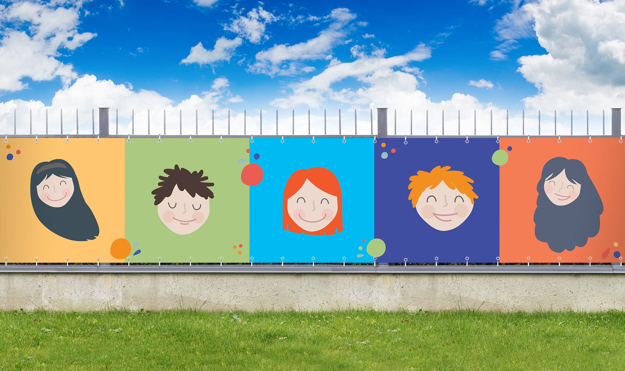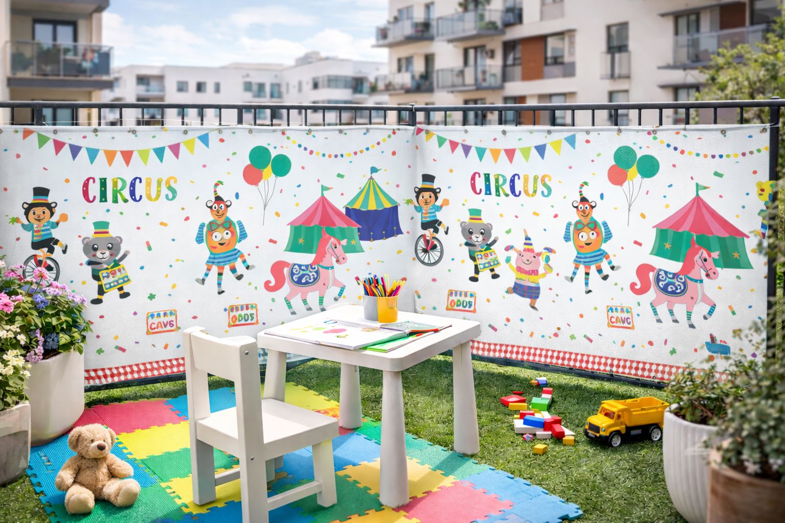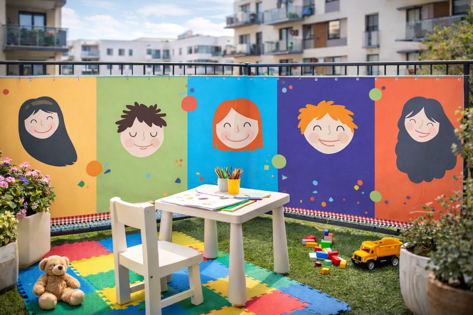 Lasten parvekesuoja kuviolla – mittatilaus yhdistää käytännöllisen näkösuojan ja lapsille suunnatun graafisen ilmeen. Se auttaa luomaan parvekkeelle yksityisemmän ja viihtyisämmän tilan, jossa lapset voivat viettää aikaa turvallisesti.
