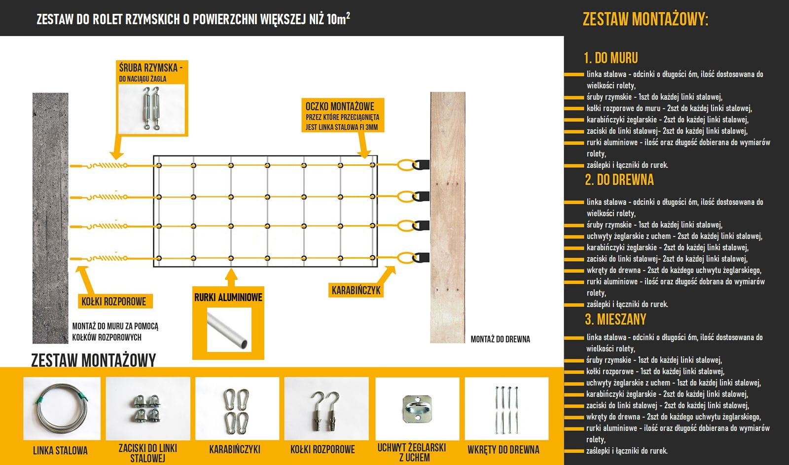 - Du kan velge monteringssett (valgfritt): opptil 5 m² – et MINI sett, fra 5 m² til 10 m² – et LITE sett, over 10 m² – et STORT sett.