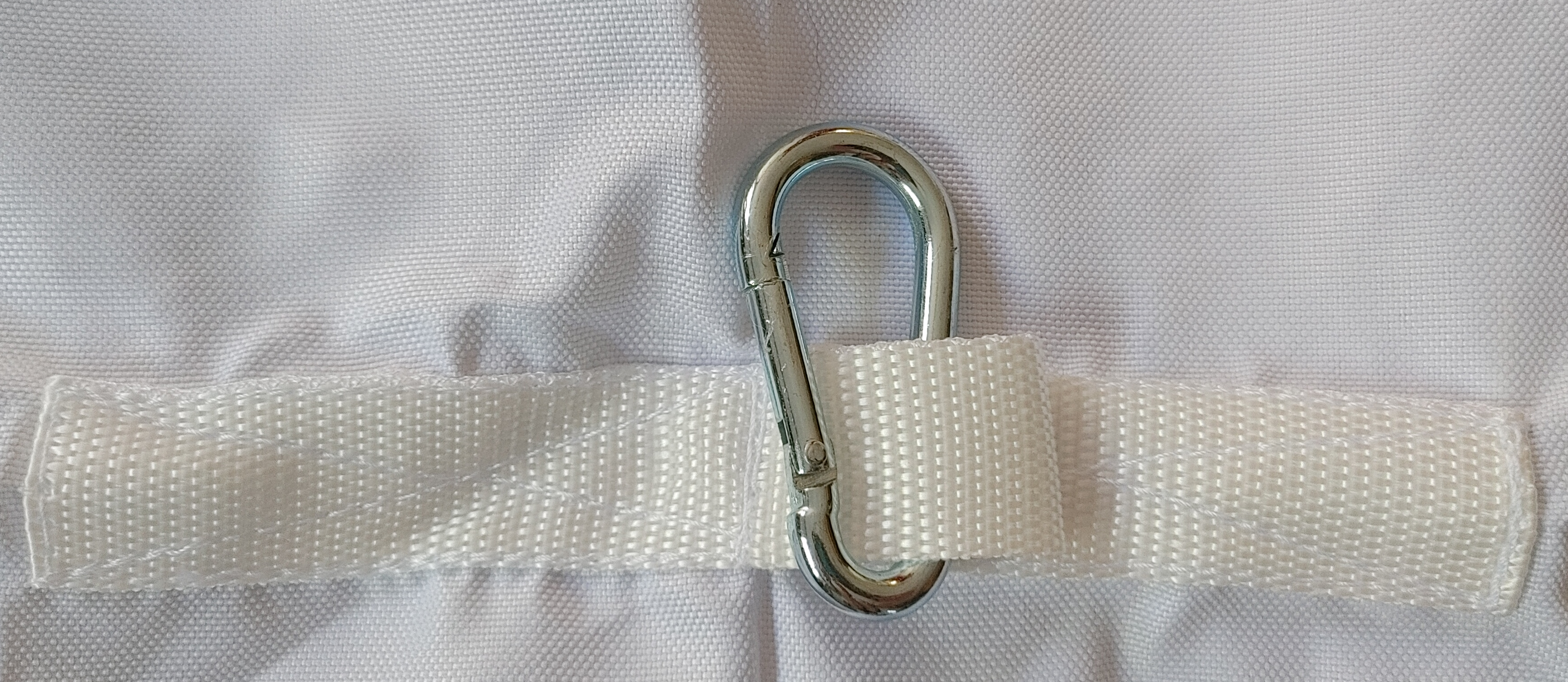 Når det gjelder solseil med sider som er lengre enn 3 m, anbefaler vi å bruke et ekstra festepunkt halvveis langs siden. Avhengig av antall rette kanter må det legges til like mange ekstra festepunkter. Prisen på dette alternativet inkluderer å sy inn et ekstra festepunkt, karabinkrok, brakett til montering i tre-, stål- eller betongkonstruksjoner.